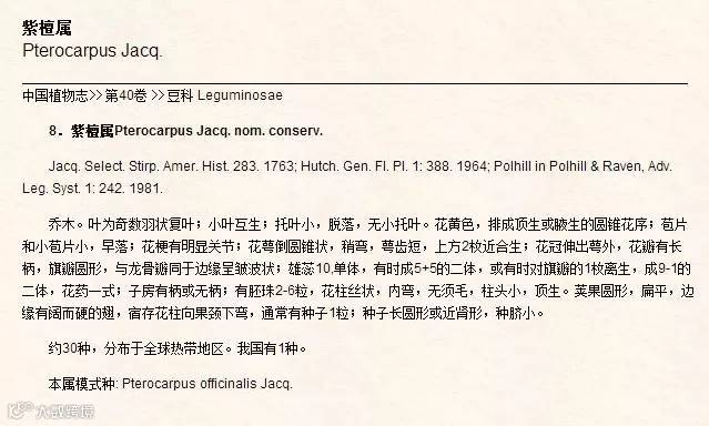 而据《中国植物志》第40卷所载,紫檀属(Pterocarpus Jacq)内的木材约30种,分布于全球热带地区。