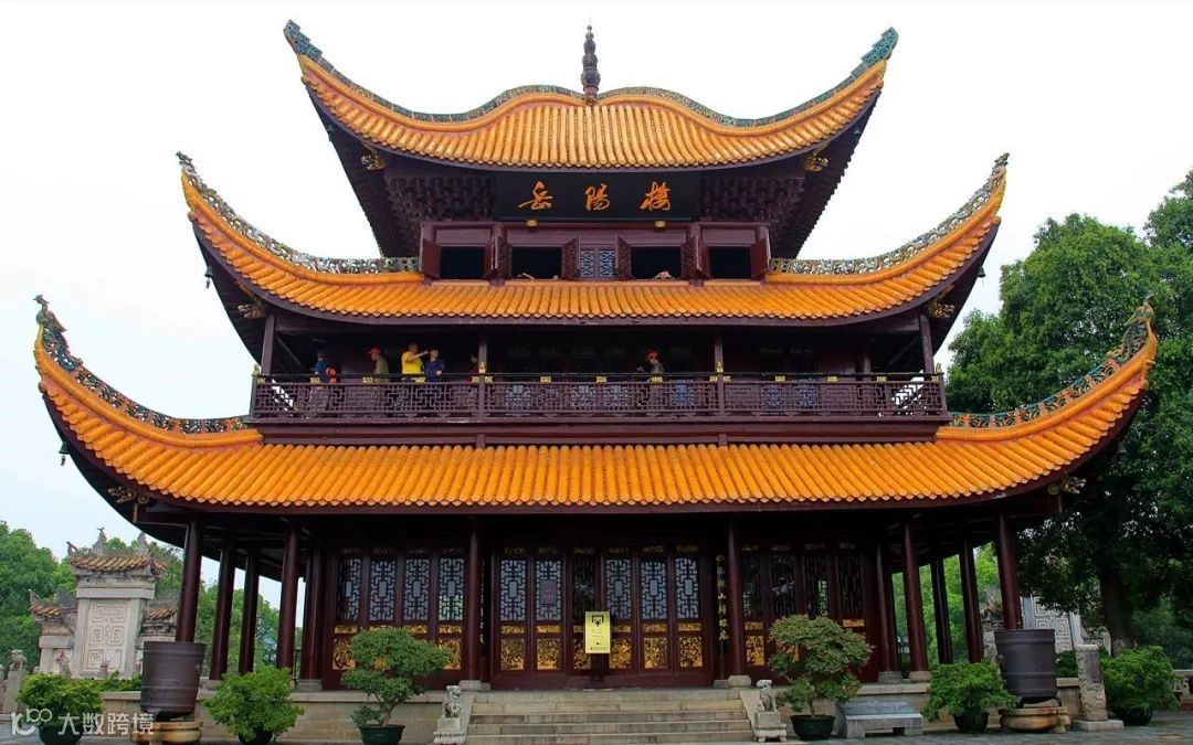 岳阳楼位于湖南省岳阳市古城西门城墙之上,主楼高19.42米,进深14.54米,宽17.42米,为三层、四柱、飞檐、盔顶、纯木结构。楼中四根楠木金柱直贯楼顶,周围绕以廊、枋、椽、檩互相榫合,结为整体。其独特的盔顶结构,体现了古代汉族劳动人民的聪明智慧和能工巧匠的精巧设计技能。