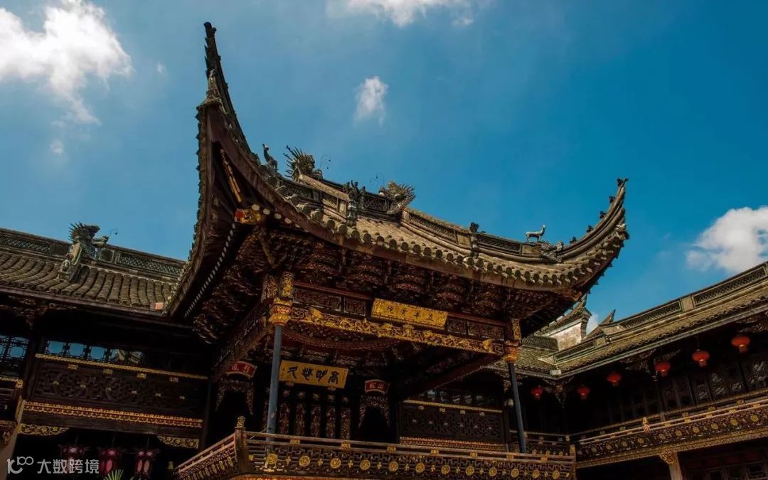 屋檐四角飞翘,如鸟展翅,由各种中国古典动物走兽图案组层的兽吻在琉璃瓦屋面的衬托下,给人以古朴、典雅、层次分明之美感。高处的宝顶在阳光下熠熠闪光,使这座古建筑更散发出金碧辉煌的魅力。