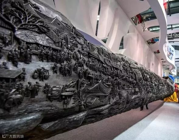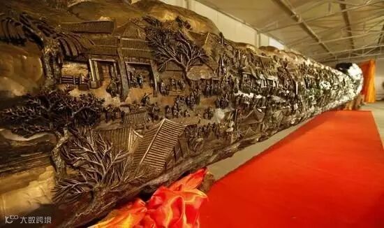 这件作品是由河南省工艺美术大师王心愿等十多位国内顶尖的雕刻艺人将北宋张择端的《清明上河图》放大两倍,采用浮雕、镂雕、圆雕、透雕等多种手法历时600多天完成,创造性地立体再现了原作的全貌。