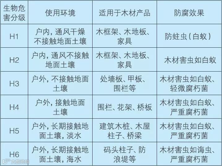 CCA防腐剂主要由铬、铜、砷三种元素组成,浓缩的CCA常呈褐色浓稠液体,稀释之后是浅绿色水状液体。砷是无色无味,铜和铬会导致防腐剂成浅绿色,铬、铜、砷这三种元素都有巨毒,一般蕴藏在矿石与土壤中。木材防腐剂中的铜砷元素主要功能是防止木材受到害虫及腐朽菌的侵害。铬主要是改善木材细胞,具有吸着防腐的功效。一般对CCA防腐处理的生物危害物分级,每个国家标准不一致,简述如下表: