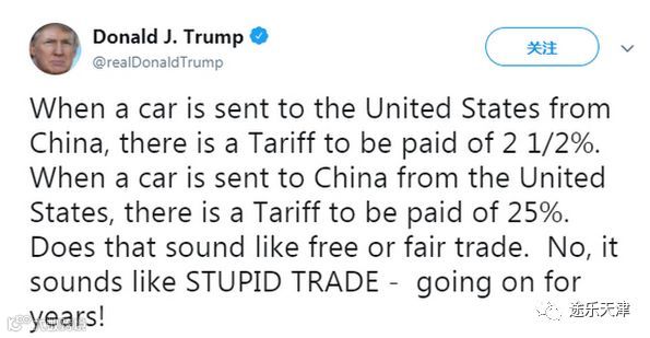 “当中国产汽车出口到美国时,只需缴2.5%的关税。而当美国汽车出口到中国时,就要缴25%的关税。这是自由贸易吗?不,这听起来是愚蠢的贸易。持续了多年。”