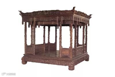 造型奇特,外形庞大,结构复杂,整体看起来如同架子床置于一个木制平台上。
