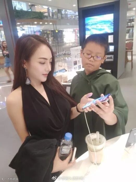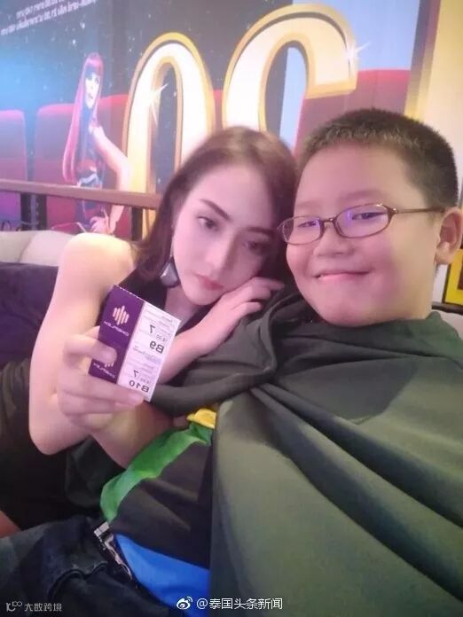 近日,泰国一小学生在脸书上传出一张美女模特依靠在自己肩头的照片