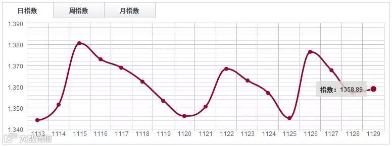 11月29日,中国木材指数(CTI)报收1179.51点,跌0.61%。其中广东鱼珠木材指数(YTI)收于1130.60点,跌0.15%;上海福人木材指数(FTI)报收1242.73点,跌1.05%;四川大西南木材指数(DTI)报收1150.70点,跌0.54%。江西南康木材指数(JTI)报收1746.07点,微涨0.03%。