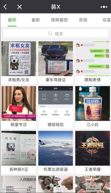 最后一项“装X”,这个选项里的功能也是非常丰富的,包括恶搞、炫富、证件、明星、微商截图等等。大家有兴趣的可以自己慢慢去研究哦。