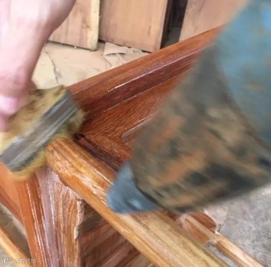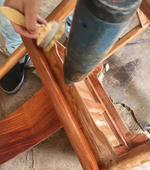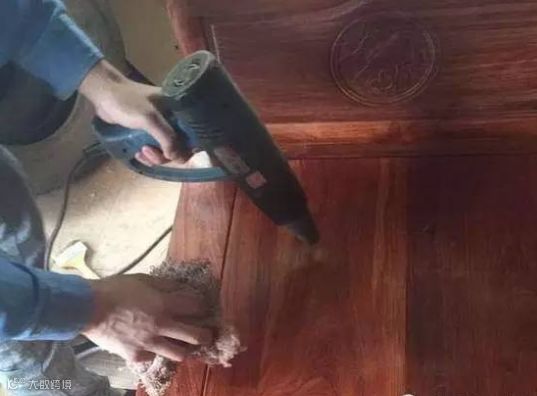 然后再用2200w的高温烤枪烘烤,使土蜂蜡完全渗透到红木家具里面,并用毛刷不停的刷到家具的每个角落: