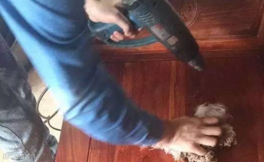完成上一步之后,接下来再用烤枪高温烘烤家具,使家具多余的土蜂蜡从家具里面溢出来,再用棉布或者棉纱把溢出来的土蜂蜡吸干净: