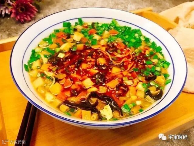 臊子面是陕西传统面食,历史悠久。臊子就是肉丁的意思,对于陕西人来说,臊子面的配色尤为重要,黄色的鸡蛋皮、黑色的木耳、红色的胡萝卜、绿色的蒜苗、白色的豆腐等材料,既好看又好吃。臊子面以薄、筋、光、煎、稀、汪、酸、辣、香而著名。它的特点是,面条细长,厚薄均匀,臊子鲜香,红油浮面,汤味酸辣,筋韧爽口,老幼皆宜。