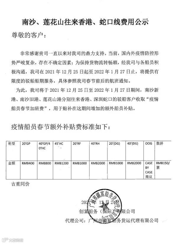 附件:创富船务最新公布的费用通知