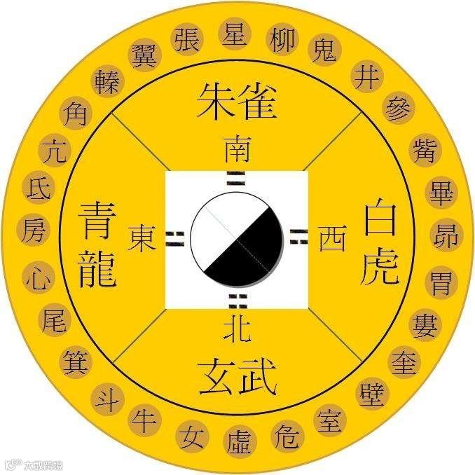 其三,以历法的甲乙为东,丙丁为南,庚辛为西,壬癸为北。以地支的子为北,午为南。其四,以东方为苍龙,西方为白虎,南方为朱雀,北方为玄武。或称作:左青龙,右白虎,前朱雀,后玄武。