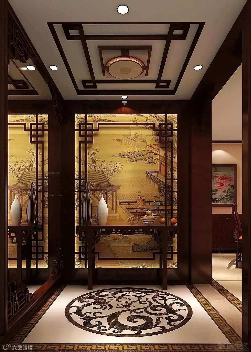 玄关的图案,宜美观大方,最好带有吉祥如意的图或辟邪的图案。