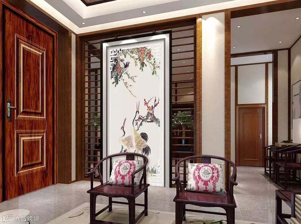 堪舆学中还有开门“宜三见”的说法,即“开门见红 开门见绿 开门见画”,这些都可以在玄关处体现。