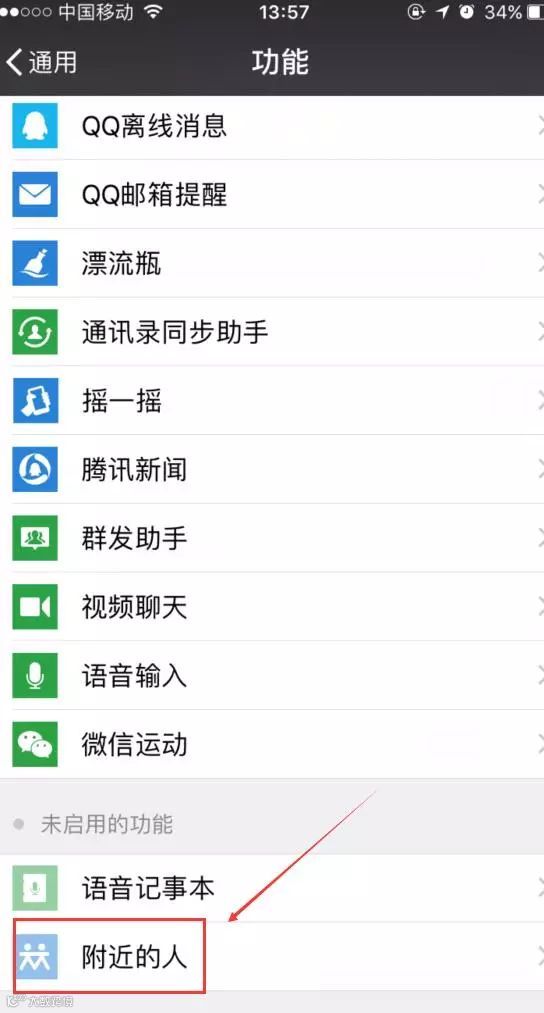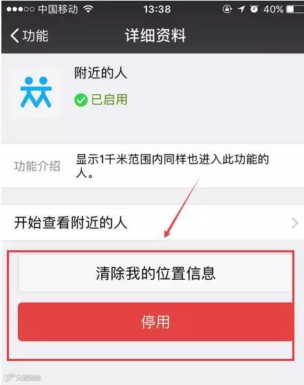 打开微信,依次点击【我】—【设置】—【通用】—【功能】,选择【附近的人】,点击进去后点击关闭【清除我的位置信息】和【停用】。