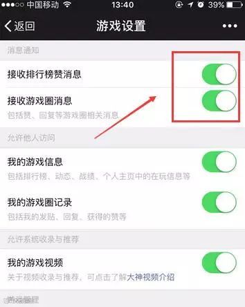 同样是进入微信后,依次点击 【发现】—【游戏】,点击页面顶部的一个圆圈的图标—然后分别将「接收排行榜赞消息」以及「接收游戏圈消息」关闭即可。