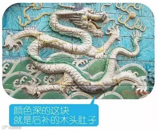 九龙壁位于皇极殿前,是一个几乎每个来故宫的游人必到的地方。九龙壁是由复杂的玻璃工艺烧制而成,每一条龙都是由许多块玻璃构件拼装成的。而在九龙壁从东数第三条白龙的身上,却有一块构件不是玻璃烧成,而是木头雕刻而成的,你能看出来了吗?