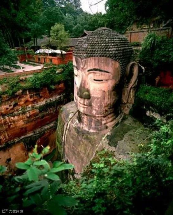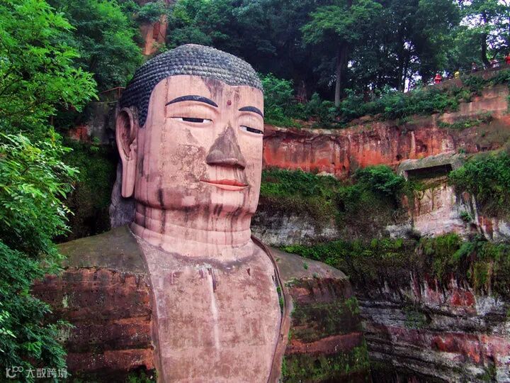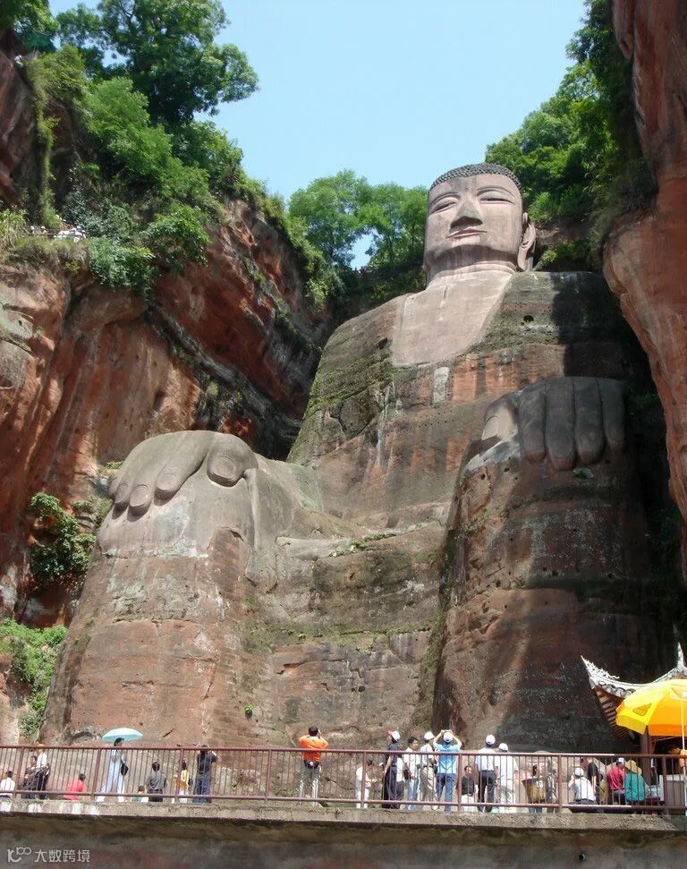 乐山大佛头与山齐,足踏大江,双手抚膝,大佛体态匀称,神势肃穆,依山凿成临江危坐。