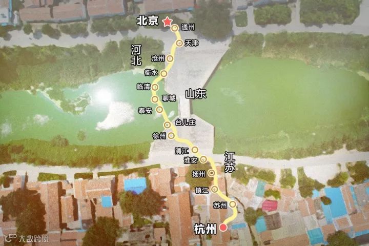 南起余杭(今杭州),北到涿郡(今北京),流经天津、河北、河南、山东、江苏和浙江,沟通海河、黄河、淮河、长江和钱塘江五大水系,全长1797千米。