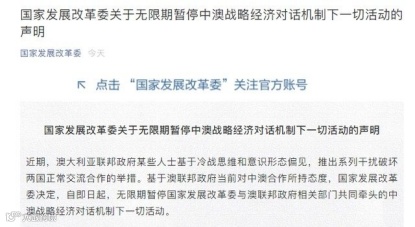 国家发改委于6日发布《国家发展改革委关于无限期暂停中澳战略经济对话机制下一切活动的声明》,声明中指出,因澳大利亚联邦政府某些人士基于冷战思维和意识形态偏见而推出系列干扰破坏两国正常交流合作的举措。对此,国家发展改革委决定无限期暂停国家发展改革委与澳联邦政府相关部门共同牵头的中澳战略经济对话机制下一切活动。