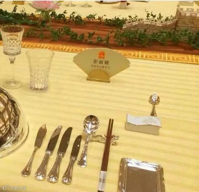 餐具方面,除中餐所需餐具外,还应摆上刀叉,左手边放叉,右手边放刀。公筷、公勺还应备有筷、勺座,其中一套应摆放在主人面前。APEC晚宴时,为嘉宾准备的餐具是银质刀叉和筷子。