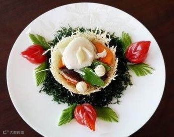 中国美食既讲究“色香味”,也讲究形美。这些菜肴姹紫嫣红,摆放也颇有意味。例如鲜带摆在土豆丝作成的“雀巢”上,就取自成语“筑巢迎凤”。