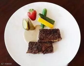 采用大连的雪花牛,烹调手法中西合璧,既用西式的黑胡椒、白兰地煎烹,又采用了中式焖制,还从营养角度配了秋葵、酸黄瓜和草莓三种蔬菜、水果。