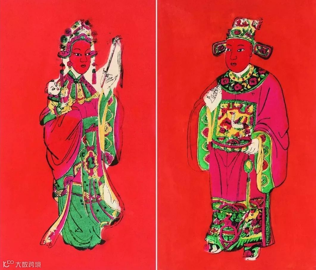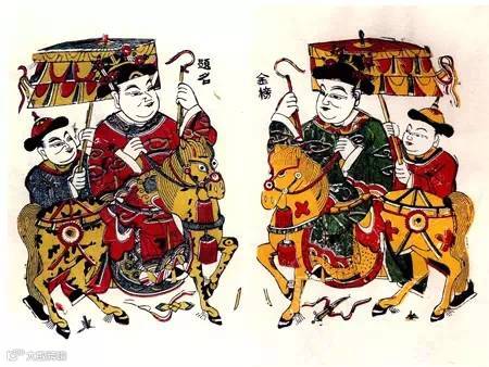 传统门神都是辟邪镇宅的武将,佛山木版年画这一男一女的门画十分独特——把“状元”(人)和“天仙”(神)并列起来,这是十分了不起的。这对门画,在新婚或年轻夫妇房门上张贴。寓意男的高中状元,女的早生贵子。期望孩子长大后必状元高中,加官进爵,富贵一生。