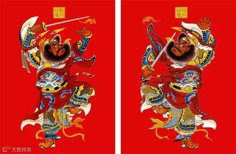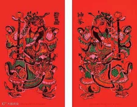 古代门神背景大多为冷色调,如今,门神或画或印在红纸上更显热闹,为新春佳节增添吉庆色彩。一片鲜红的门神,最终和红福字、红对联、红鞭炮一起,构成了中国人对于新年的色彩记忆。