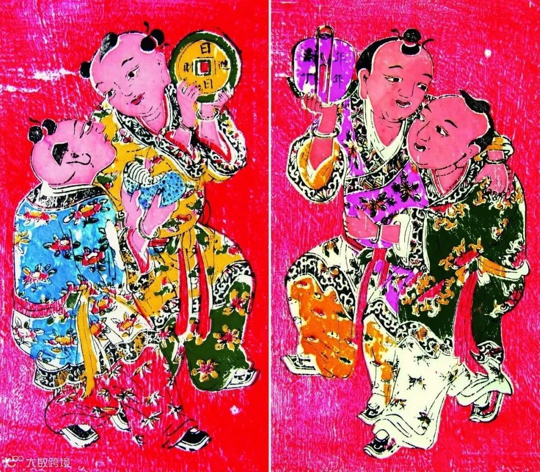 左幅为两童子手捧铜钱和元宝,寓意多多发财。此类年画既求子也求财,多贴于新婚夫妇的房门上。