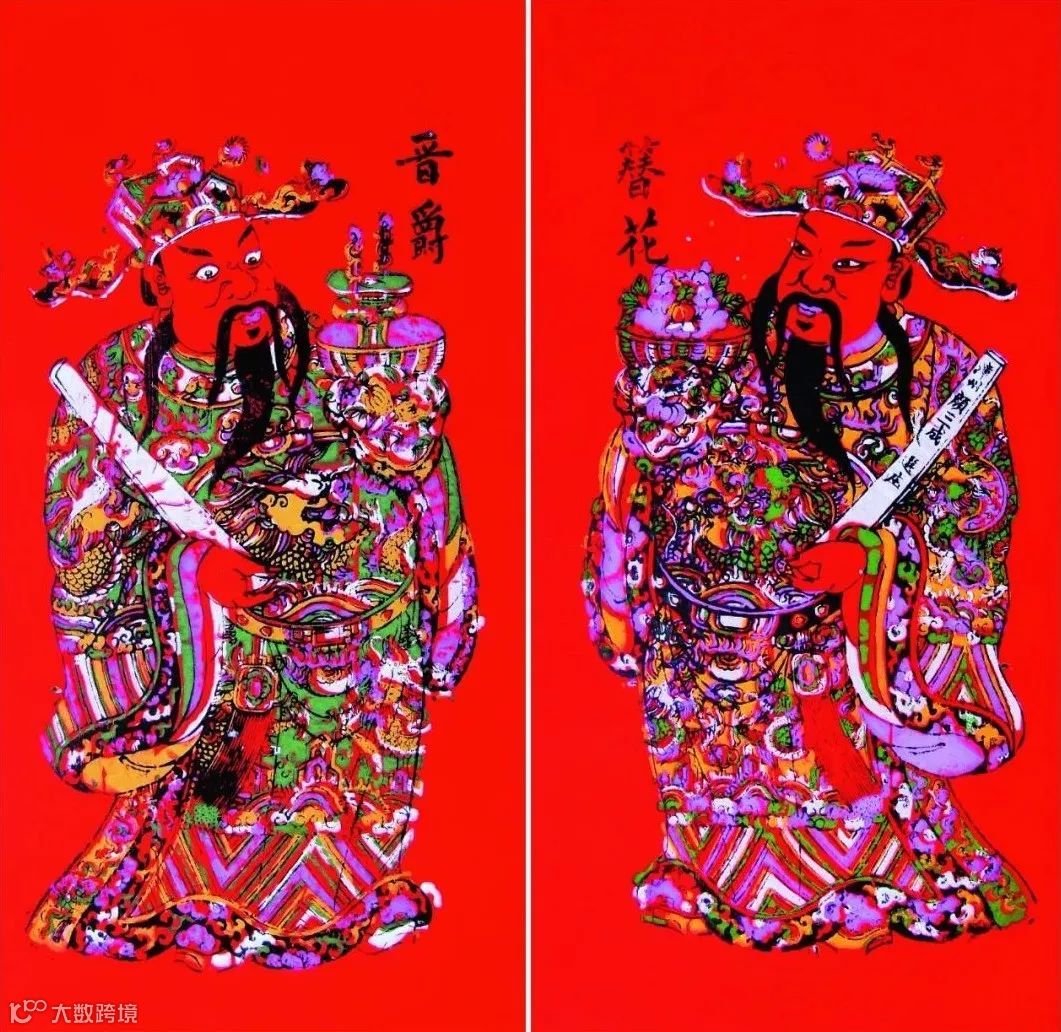 此对文门神尺寸为同类中最大者,色彩绚丽,有力的烘托了吉祥喜庆的气氛。画中人物为朝官打扮,雍容华贵。两人着蟒袍,相对而立,皆一手持笏板,一手托盆,盆中有牡丹花和酒爵。盆中牡丹花,寓意拈得花魁大富大贵,酒爵寓意爵位。