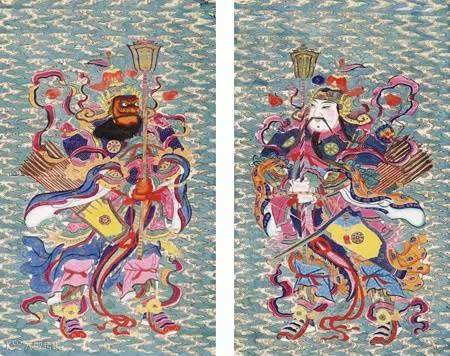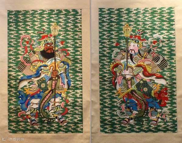 此为道教门神画。道教传说青龙为东方之神,白虎为西方之神,一主凶,一主吉。青龙孟章神君,白虎监兵沈军,是道馆山门二大神,守护四方,祈福平安,也是道教信徒家中常见的门神画。