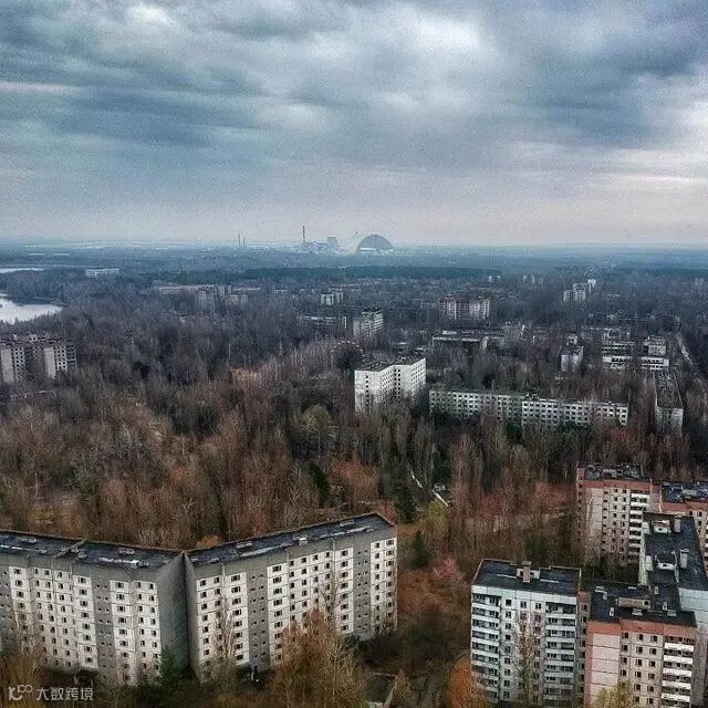 鬼城普里皮亚季和远处的切尔诺贝利4号反应堆