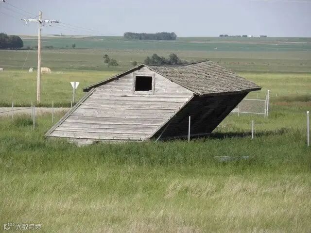 一所废弃的房子,以前是方形,现在变成平行四边形了