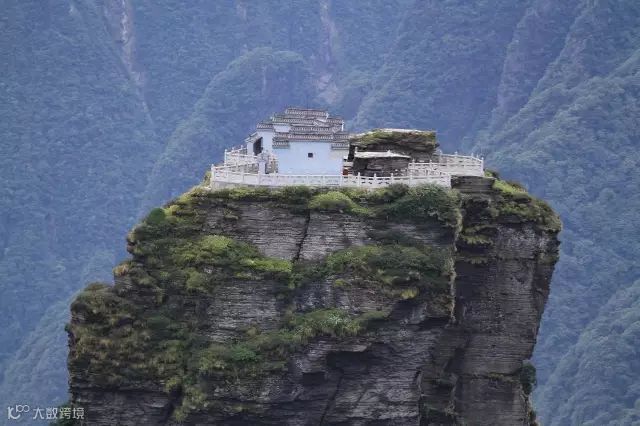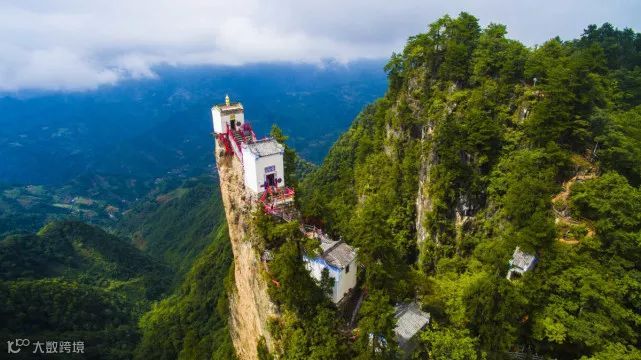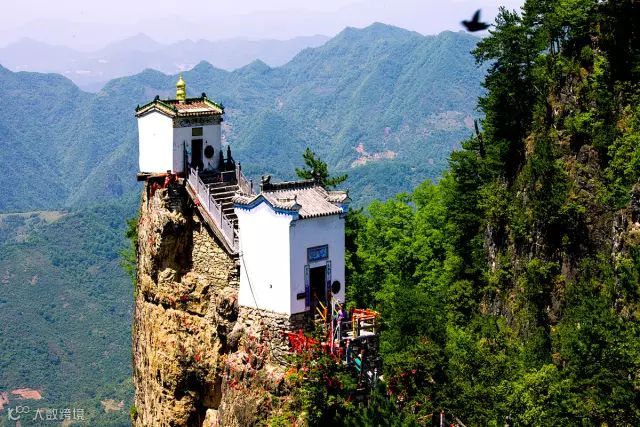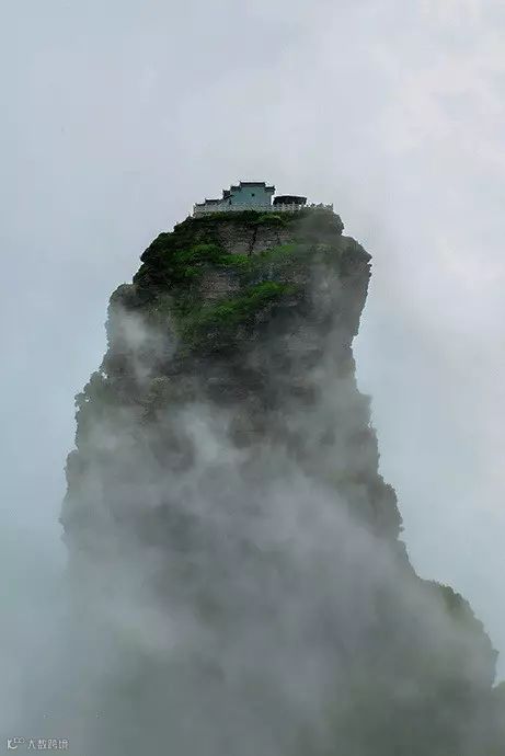 凌空翘首于万仞绝壁之上,三面悬于万丈深渊,是用4根石柱插入石缝,仿若云端上的仙景。
