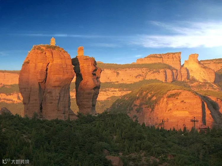 北峰较为粗大,南峰则上粗下细、看起来有些“摇摇欲坠”。两座石峰四面均为陡峭的丹崖绝壁,高不可攀,近代以来尚未有人仅凭人力成功登顶。