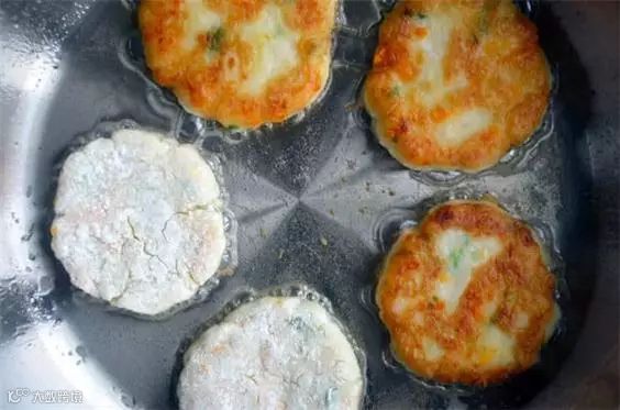 3、中火热锅,加入花生油,油热后把土豆饼放进去,翻煎3分钟左右,待土豆泥变成金黄色即可。
