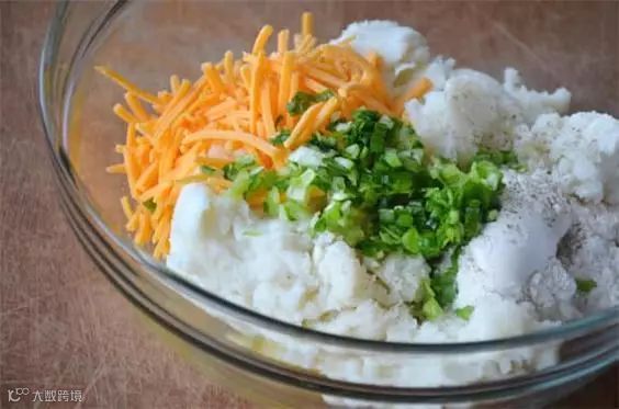 1、把土豆泥放到碗里,加入碎奶酪、鸡蛋、葱碎和3汤匙面粉,搅拌均匀。