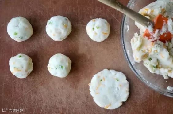 2、捏成大小均匀的土豆团,压扁成饼状,撒些面粉。