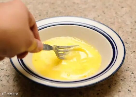 3、用叉子搅拌,让蛋黄、蛋清和牛奶融合在一起。
