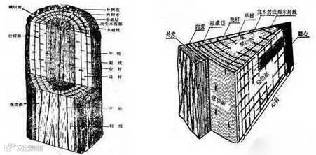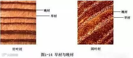每一圈年轮由两部分木材组成:树干中靠近髓心一侧,树木每年生长季节早期形成一部分木材称为早材;而靠近树皮一侧,树木每年生长后期形成的一部分木材称为晚材。