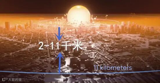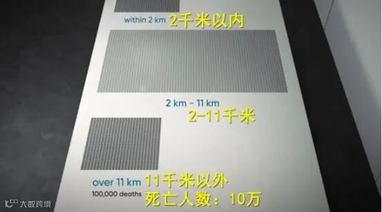 核爆炸产生的大量灰烬与粉尘都具有放射性伤害,视频制作人表示,11公里内因为放射性伤害,大约会死亡10万人左右。