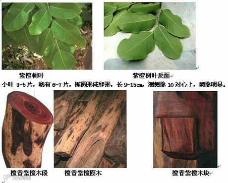 国家标准《红木》规定的紫檀木仅指檀香紫檀。由于檀香紫檀树叶较同属其他树种小,故市场上又称“小叶檀”。野生的紫檀木生长缓慢,非百年不能成材,根部通常腐朽成空洞,故有“十檀九空”之说。在木材横切面上可见闪闪发亮的树胶,所以又有金星紫檀、天星紫檀和鸡血紫檀之称。