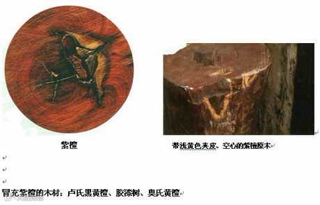 紫黄:一般为人工引种,径级较大,少有空洞,比重接近1。从外表看与一般紫檀没有区别,但端面紫色圈与黄色圈相连,色差明显。家具商先将其涂成紫檀色,再进行固化处理,一般买家是难以发现的,这种紫檀木被木材商称为“缅甸大叶紫檀”,其价格仅为前三种紫檀木的十分之一。