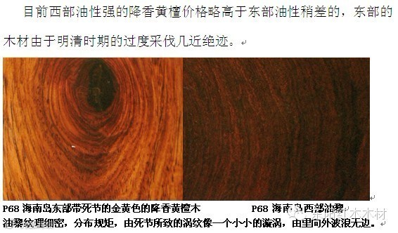 降香黄檀产于中国海南岛,产地又分为东部平原丘陵和西部崇山峻岭。东部的黄花梨地处土质疏松的平原和丘陵,生长较快,一般树干较粗大笔直,木材颜色浅一些,棕眼大,纹理直,鬼脸少,油性差,密度小。相反,西部的黄花梨生长在土质较差的山区,生长环境不好导致树木生长缓慢,树干较细,不直并枝杈丛生,木材颜色深一些,棕眼细腻,纹理富于变化,鬼脸多,油性重,密度大。