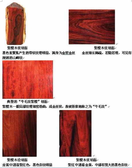 金星紫檀:因紫檀木导管充满桔红色树胶及紫檀素而使全身或局部产生肉眼可见的金星金丝,有质感极强,此为上品。