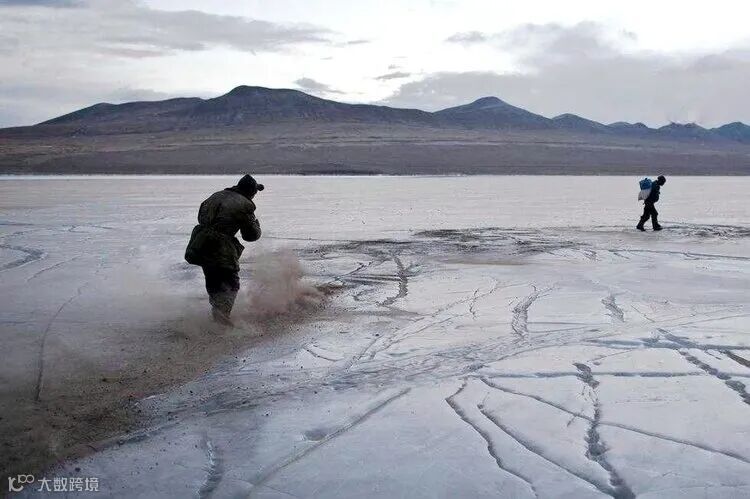 用牛粪灰在湖岸到湖心岛的冰面上
