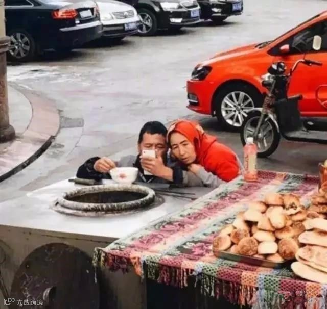 路过的烤馕摊,摊主夫妇正在和儿子视频,两个人目光牢牢锁定那一方小小的屏幕,连手里的饭都忘记了吃。