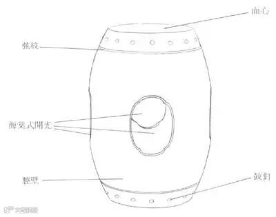 绣墩吸收了古代花鼓的特点,一直都保持其基本样式没有太大变化:呈鼓形,两端小中间略大,是器身‘开光’成海棠式、梅花式、桃式、三角式等诸多式样,在上下两头各做出‘弦纹’一道,雕出象征鼓钉的钉帽,腔壁的四周或为素面,或装饰有各种图案,既简单又美观。