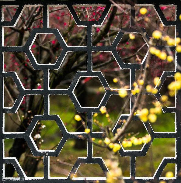 水秀山青眉远长,归来闲倚小阁窗。花窗是江南园林中有名的装饰,不仅可以使墙面上产生虚实的变化,而且由于它隔了一层窗花,可使两侧相邻空间似隔非隔,景物若隐若现,富于层次,并具有“避外隐内”的意味。