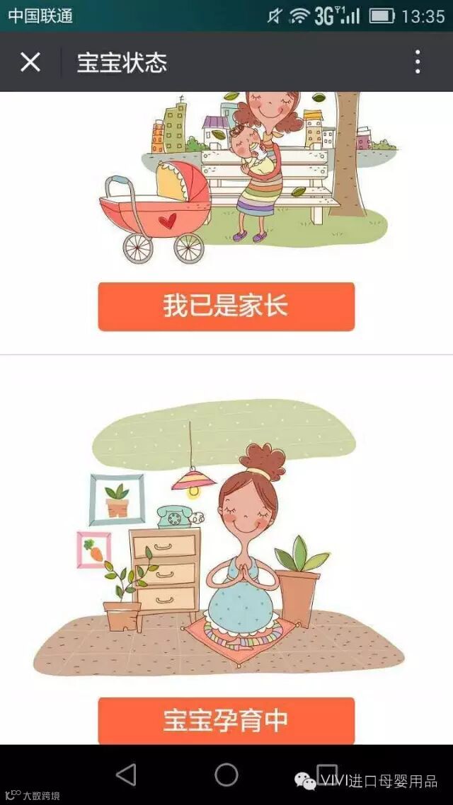 1、微信关注“VIVI进口母婴用品”点击“点击注册”,选择宝宝状态信息。
